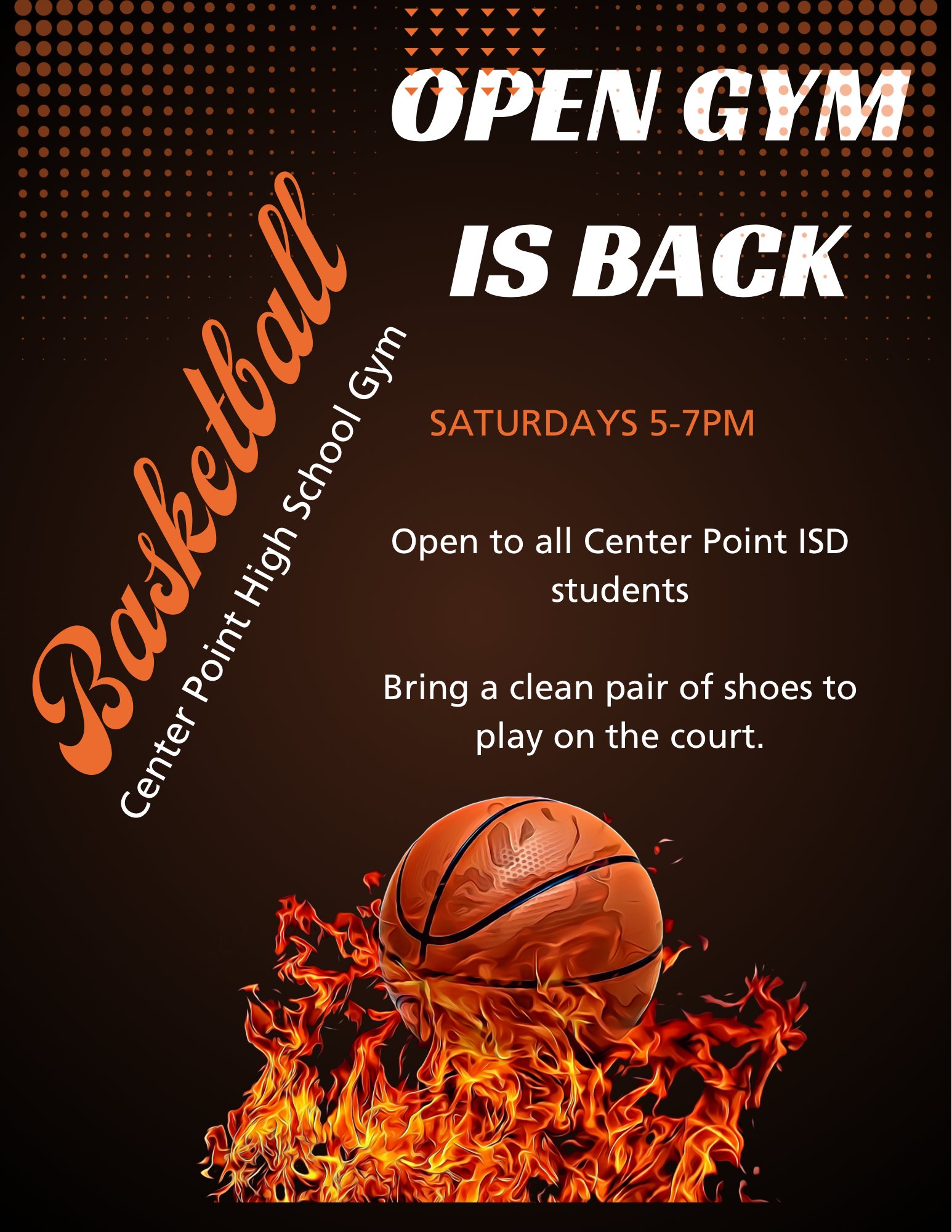 Coach Master will be hosting open gym on Saturdays at the High School. DATE: Begins this Saturday, February 28th TIME: 5:00 to 7:00 PM LOCATION: HS Gym WHO: This is open to all Center Point ISD stu...