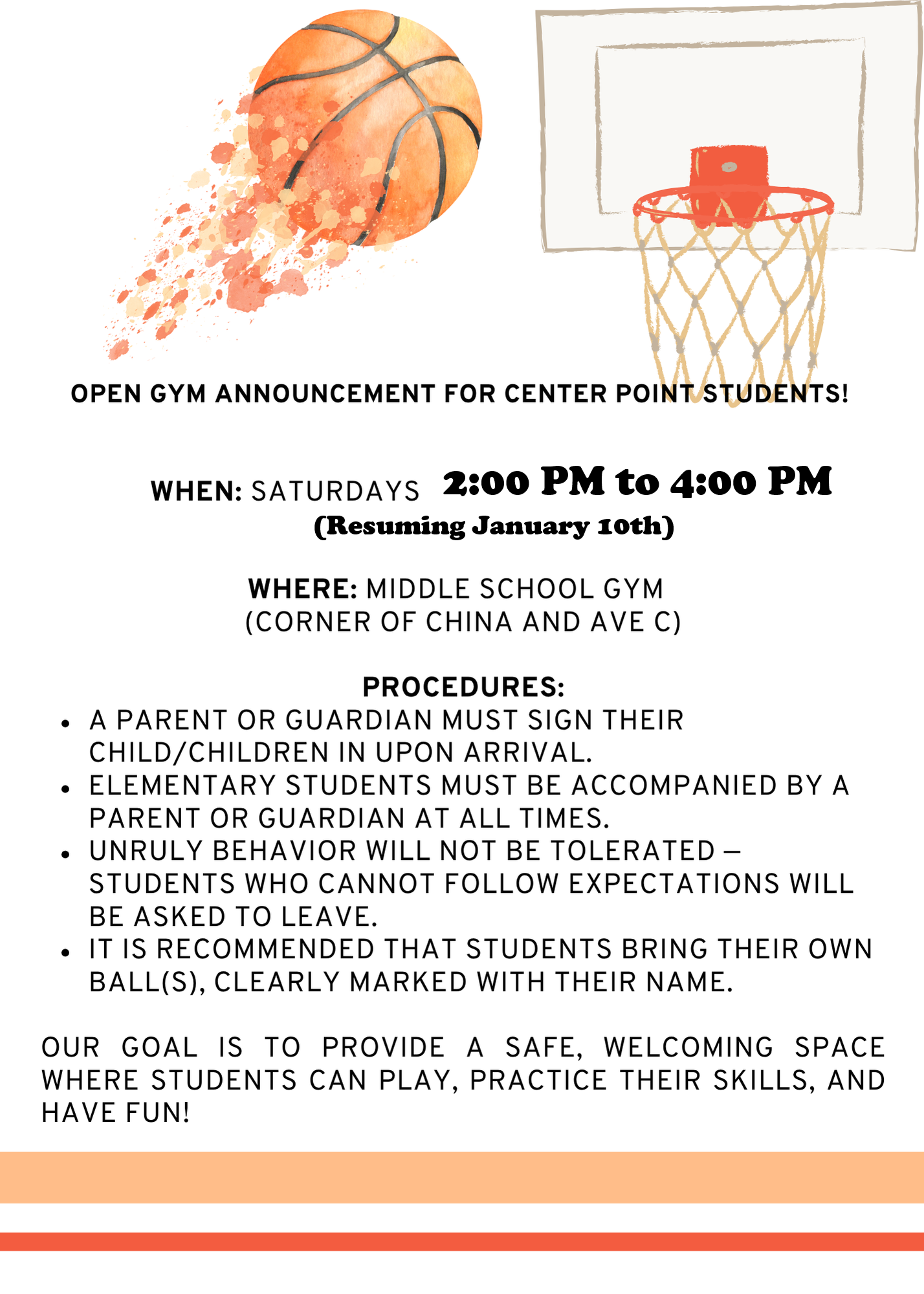 Open Gym Survey: https://forms.gle/Join us this Saturday (January 10th) at 2pm. Bring clean shoes and a basketball.