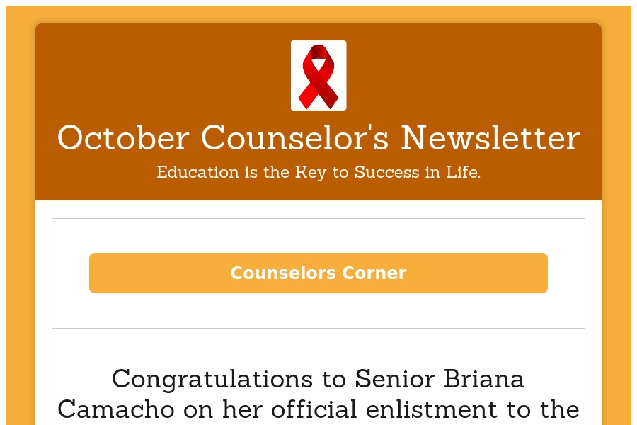 October Counselor's Newsletter Education is the Key to Success in Life. Counselors Corner Congratulations to Senior Briana Camacho o. . .