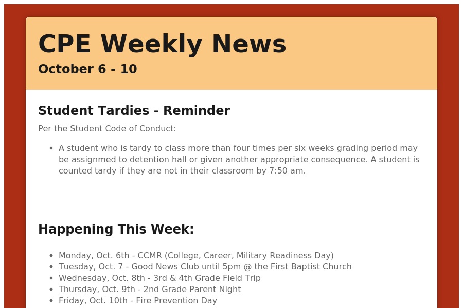CPE Weekly News September 30 - October 3 *** Student Tardies *** Per the Student Code of Conduct: A student who is tardy to class more than four times per six weeks gradi. . .